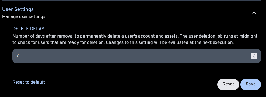 The user deletion job runs at midnight to check for users that are ready for deletion. Changes to this setting will be evaluated at the next execution.